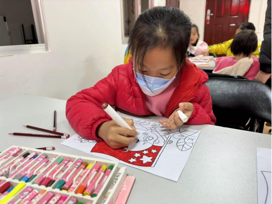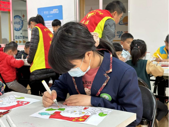 隨后,志愿者與孩子們進(jìn)行繪畫創(chuàng)作。孩子們充分發(fā)揮各自的想象力,用鮮艷活潑的色彩描繪出他們心中對祖國的定義。一幅幅充滿童趣、充滿幻想、富有活力的畫面躍然紙上,用稚嫩的畫筆展示了他們眼中的社會主義核心價值觀,活動現(xiàn)場其樂融融。