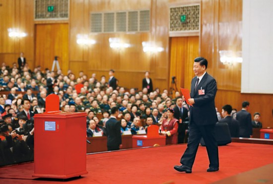 2018年3月17日,十三屆全國人大一次會(huì)議在北京人民大會(huì)堂舉行第五次全體會(huì)議。習(xí)近平當(dāng)選中華人民共和國主席、中華人民共和國中央軍事委員會(huì)主席。這是習(xí)近平準(zhǔn)備投票。 新華社記者 蘭紅光/攝