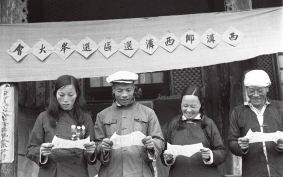 山西省平順縣西溝鄉(xiāng)西溝區(qū)在1953年9月27日舉行選舉大會(huì)。全國著名農(nóng)業(yè)勞動(dòng)模范李順達(dá)、申紀(jì)蘭被選為西溝鄉(xiāng)人民代表大會(huì)的代表。圖為在西溝區(qū)選舉大會(huì)上被選為代表的(自左起)申紀(jì)蘭、李順達(dá)、韓春蘭和張秋全在觀看當(dāng)選證書的情形。 新華社記者 項(xiàng)化庚/攝