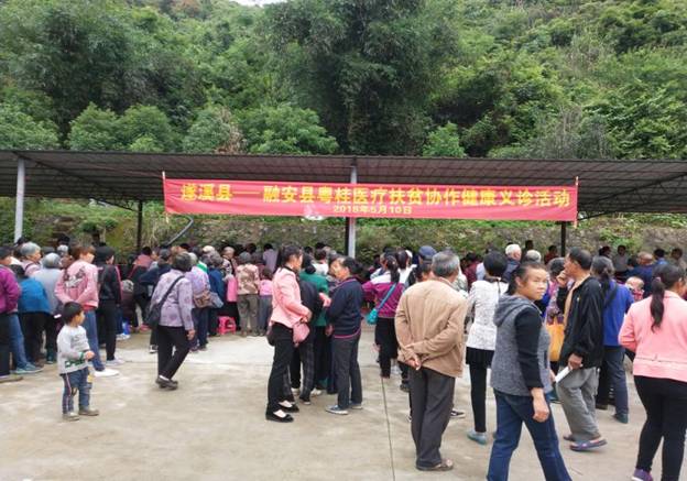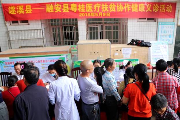 2018年5月9日至10日,在遂溪縣駐融安扶貧協(xié)作工作組協(xié)調(diào)下,遂溪縣人民政府黃小平副縣長、政協(xié)張卓軍副主席率衛(wèi)計系統(tǒng)副高以上專家13人來到融安縣開展結(jié)對幫扶以來的第二次義診和捐贈活動。