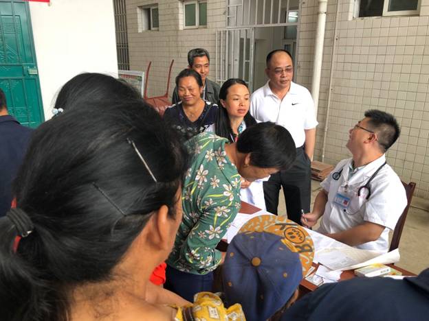 由遂溪縣各醫(yī)療結(jié)構(gòu)專家組成的醫(yī)療服務隊在遂溪縣黃小平副縣長、張卓軍副主席,融安縣委常委、副縣長劉喜等人的陪同下,顛簸了近兩個小時的山路后抵達深度貧困鄉(xiāng)鎮(zhèn)大將鎮(zhèn)、泗頂鎮(zhèn)開展義診幫扶活動。活動現(xiàn)場人頭攢動,前來咨詢和診療的群眾絡繹不絕,專家們熱情耐心地接待每一位來診群眾,詳細了解有關(guān)病情病史,科學對診開出藥方,免費發(fā)放藥物。由于前來就診的群眾太多,義診隊忙壞了。特別是面對老人時,不僅需要耐心講解,語言不通時還得馬上“搬救兵”翻譯。從9時30分開始,義診隊一直忙到13時多才用20多分鐘匆忙吃午飯,之后又繼續(xù)工作一直到近16時。