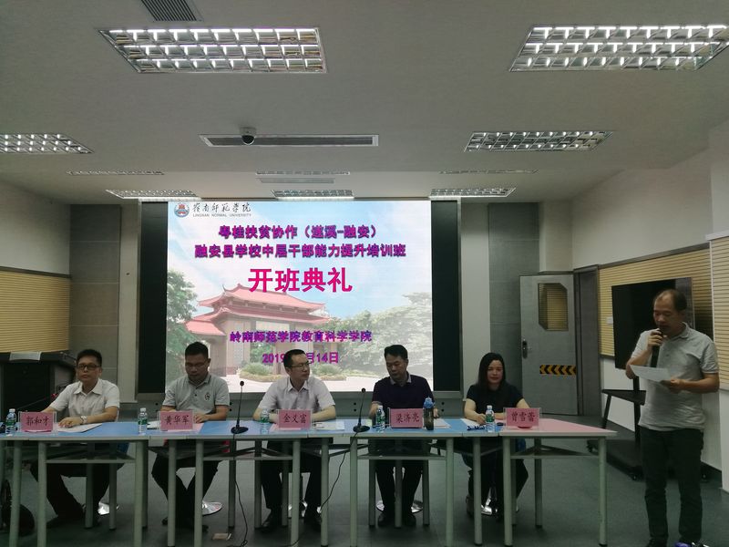 5月14日上午,粵桂扶貧協(xié)作(遂溪-融安)教育幫扶活動(dòng)-融安縣學(xué)校中層干部能力提升培訓(xùn)班在湛江市嶺南師范學(xué)院正式開(kāi)班。學(xué)院副院長(zhǎng)金義富、融安縣教育局副局長(zhǎng)梁濟(jì)亮、遂溪縣教育局副局長(zhǎng)黃華軍、融安縣粵桂扶貧協(xié)作專責(zé)小組成員余秋寧及全體學(xué)員共同出席開(kāi)班儀式。