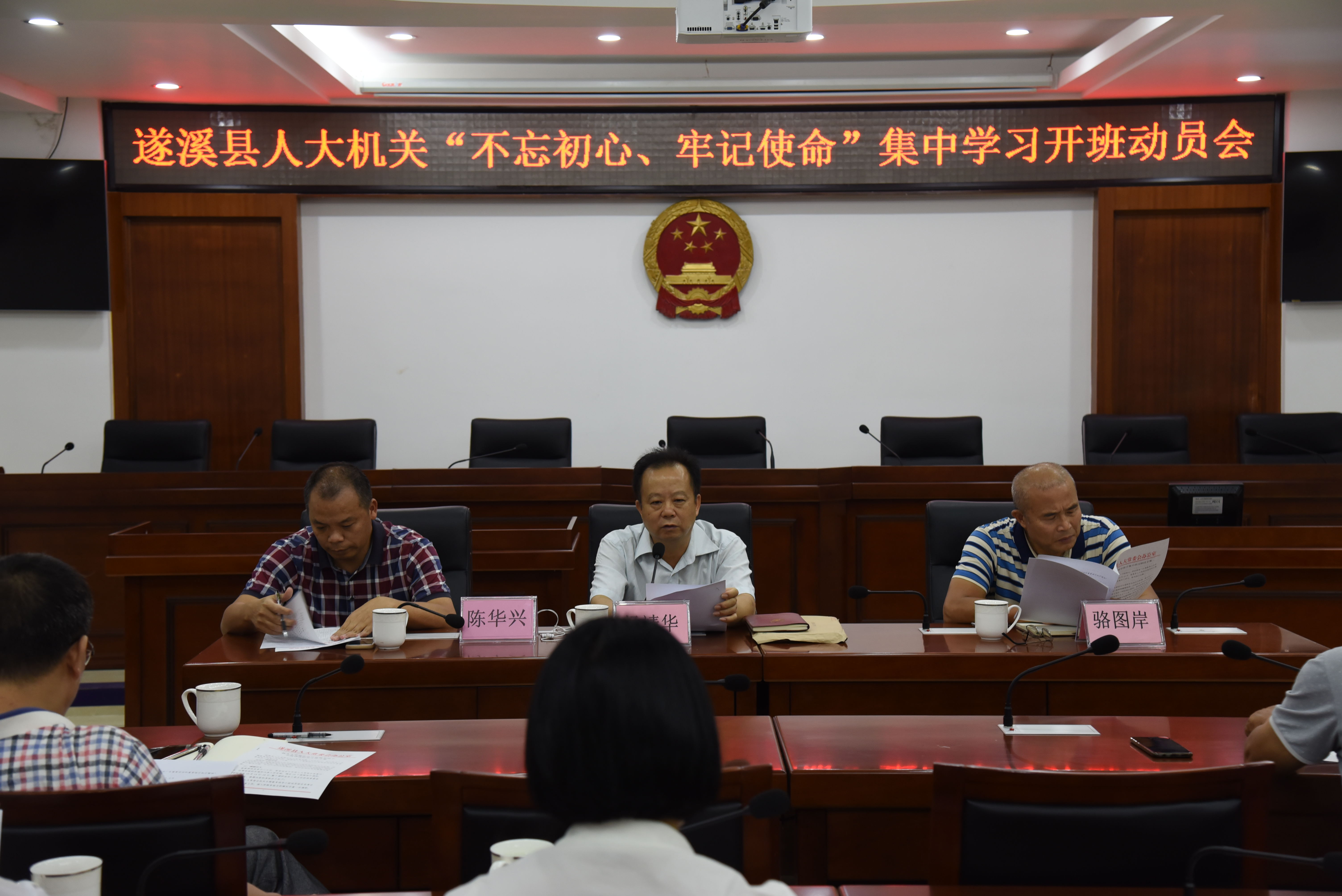 10月8日下午,遂溪縣人大機關黨支部召開“不忘初心、牢記使命”學習動員會。黨支部副書記陳華興作學習研討活動安排部署,辦公室主任、黨支部書記楊靖華作動員講話??h委主題教育指導組第一組副組長、縣直工委副書記駱圖岸參加會議。