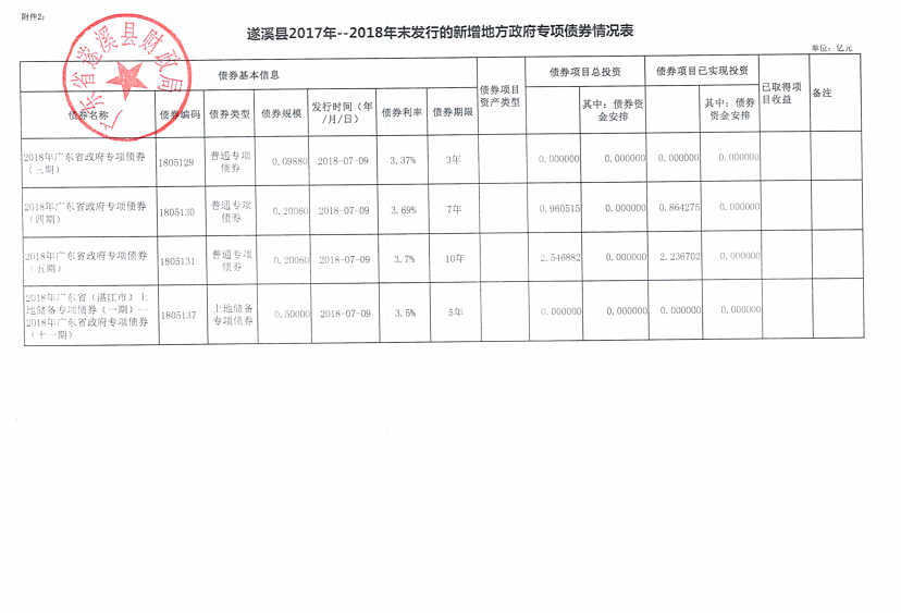 附件2:遂溪縣2017年--2018年末發(fā)行的新增地方政府專項債券情況表 | | 作者:縣財政局 | 來源:本網(wǎng) | 時間:2019-08-30 15:56:44 點擊數(shù):- 【打印正文】