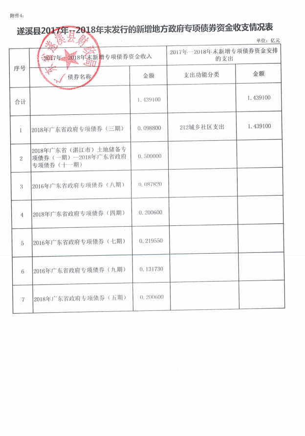 附件4:遂溪縣2017年--2018年末發(fā)行的新增地方政府專項債券資金收支情況表 | | 作者:縣財政局 | 來源:本網(wǎng) | 時間:2019-08-30 15:56:44 點擊數(shù):- 【打印正文】