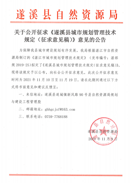 關(guān)于公開征求《遂溪縣城市規(guī)劃管理技術(shù)規(guī)定(征求意見稿)》意見的公告 | | 作者: | 來源:遂溪縣自然資源局 | 時(shí)間:2021-11-10 16:07:19 點(diǎn)擊數(shù):- 附件 遂溪縣城市規(guī)劃管理技術(shù)規(guī)定(征求意見稿).pdf 【打印正文】