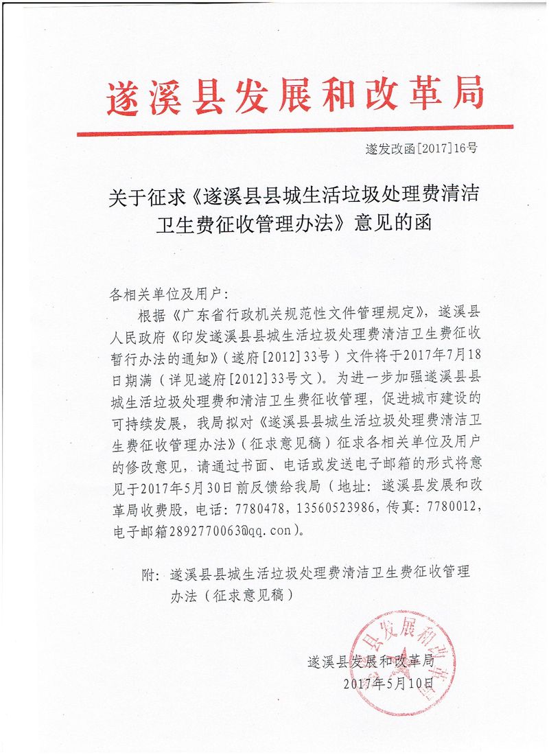 關(guān)于征求縣城生活垃圾處理費(fèi)清潔衛(wèi)生費(fèi)征收管理辦法意見(jiàn)的函 | | 作者: | 來(lái)源:本網(wǎng) | 時(shí)間:2017-05-10 15:49:39 點(diǎn)擊數(shù):- 遂溪縣縣城生活垃圾處理費(fèi)清潔衛(wèi)生費(fèi)征收管理辦法(征求意見(jiàn)稿) 【打印正文】