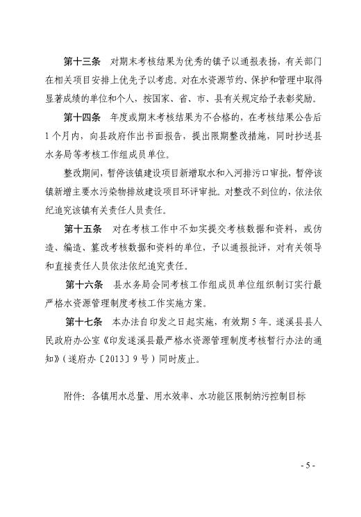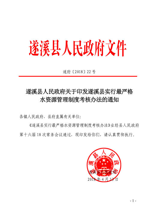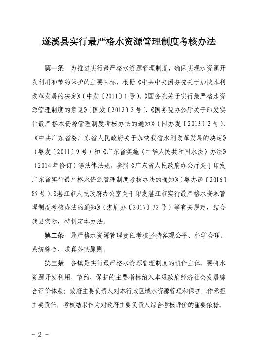 遂府規(guī)—2018—007 遂溪縣人民政府關于印發(fā)遂溪縣實行最嚴格水資源管理制度考核辦法的通知(遂府〔2018〕22號) | | 作者:縣人民政府 | 來源:縣人民政府 | 時間:2018-04-16 18:08:24 點擊數:- 政策解讀鏈接:關于《遂溪縣實行最嚴格水資源管理制度考核辦法》的政策解讀 【打印正文】