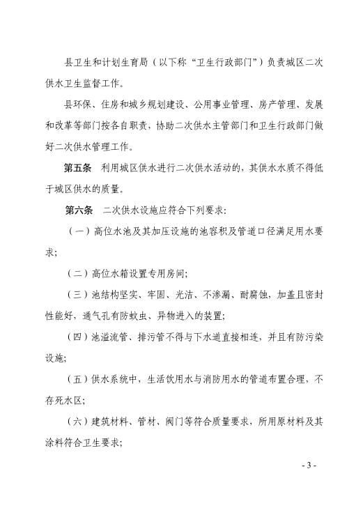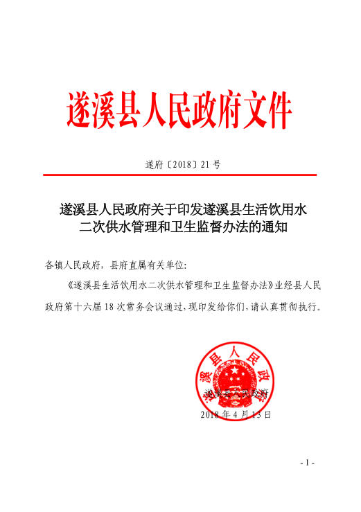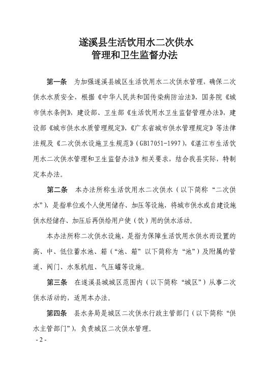 遂府規(guī)—2018—006 遂溪縣人民政府關(guān)于印發(fā)遂溪縣生活飲用水二次供水管理和衛(wèi)生監(jiān)督辦法的通知(遂府〔2018〕21號) | | 作者:縣人民政府 | 來源:縣人民政府 | 時間:2018-04-16 18:03:08 點擊數(shù):- 【打印正文】