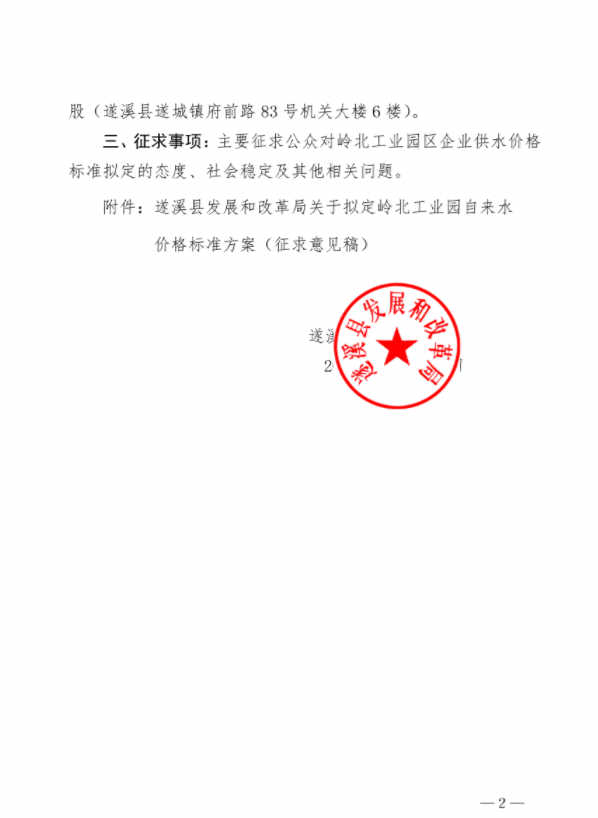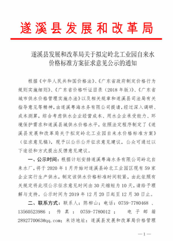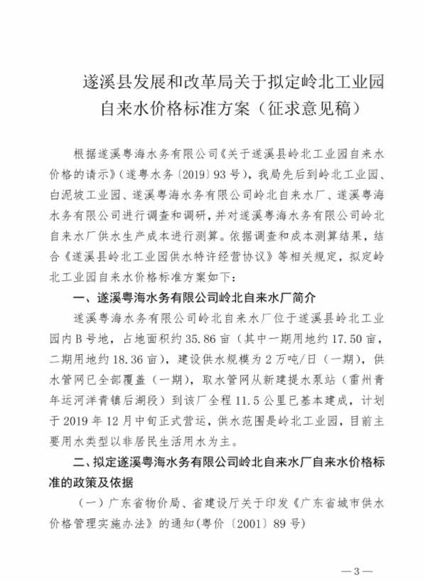 遂溪縣發(fā)展和改革局關于擬定嶺北工業(yè)園自來水價格標準方案征求意見公示的通知 | | 作者: | 來源:遂溪縣發(fā)改局 | 時間:2019-12-20 17:11:11 點擊數(shù):- 【打印正文】