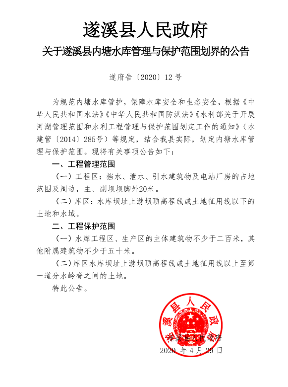 關于遂溪縣內塘水庫管理與保護范圍劃界的公告