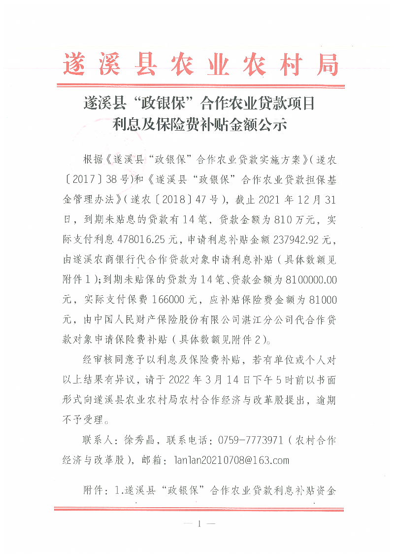 遂溪縣“政銀?!焙献鬓r(nóng)業(yè)貸款項(xiàng)目利息及保險(xiǎn)費(fèi)補(bǔ)貼金額公示 | | 作者: | 來源:本網(wǎng) | 時(shí)間:2022-03-07 09:48:49 點(diǎn)擊數(shù):- 附件:1.遂溪縣“政銀?!焙献鬓r(nóng)業(yè)貸款利息補(bǔ)貼資金申請表.xlsx2.遂溪縣“政銀?!焙献鬓r(nóng)業(yè)貸款保險(xiǎn)費(fèi)補(bǔ)貼資金申請表 .xlsx 【打印正文】