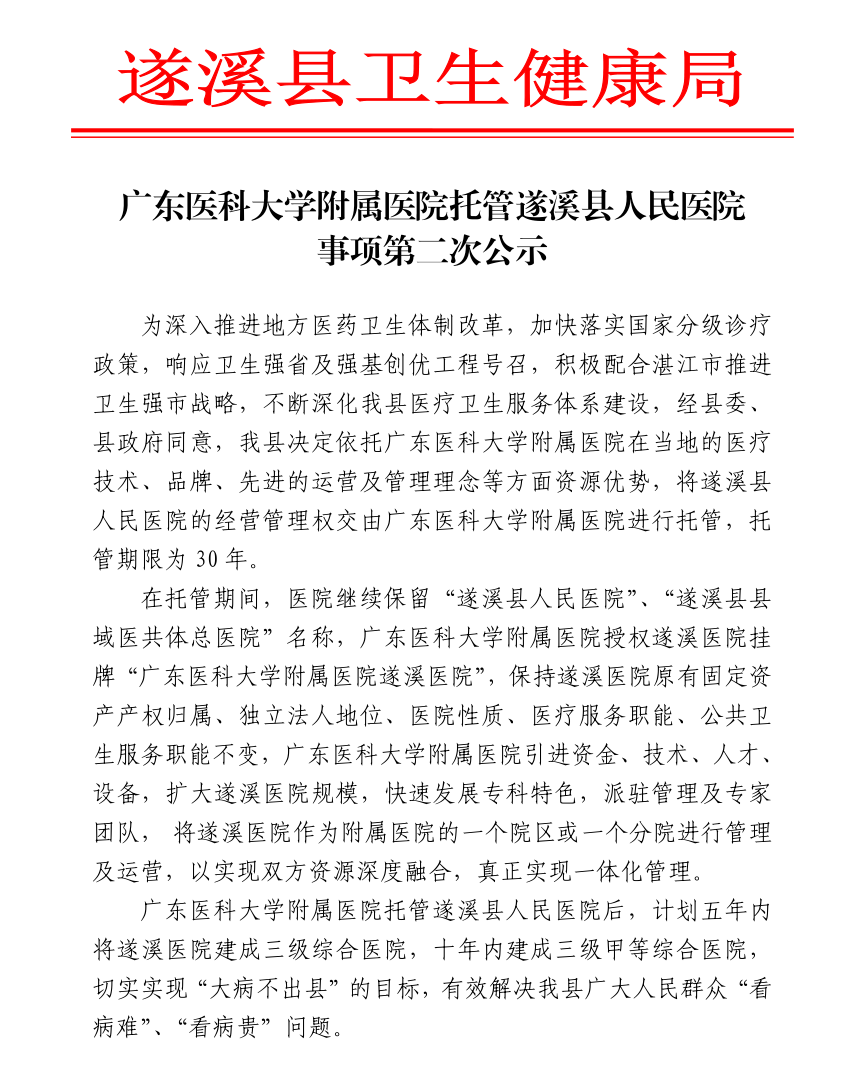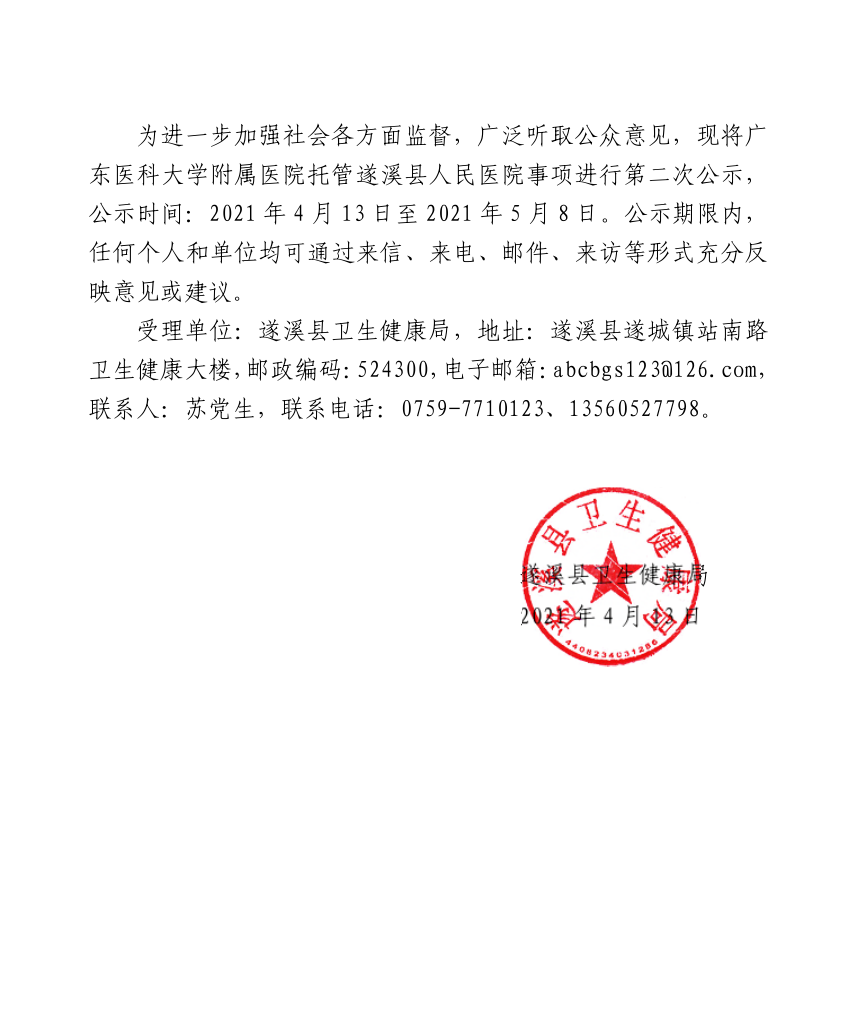 廣東醫(yī)科大學(xué)附屬醫(yī)院托管遂溪縣人民醫(yī)院事項(xiàng)第二次公示 | | 作者: | 來源:遂溪縣衛(wèi)生健康局 | 時(shí)間:2021-04-13 22:06:24 點(diǎn)擊數(shù):- 廣東醫(yī)科大學(xué)附屬醫(yī)院托管遂溪縣人民醫(yī)院事項(xiàng)第二次公示2021-04-13.pdf 【打印正文】