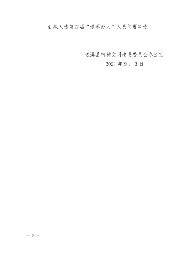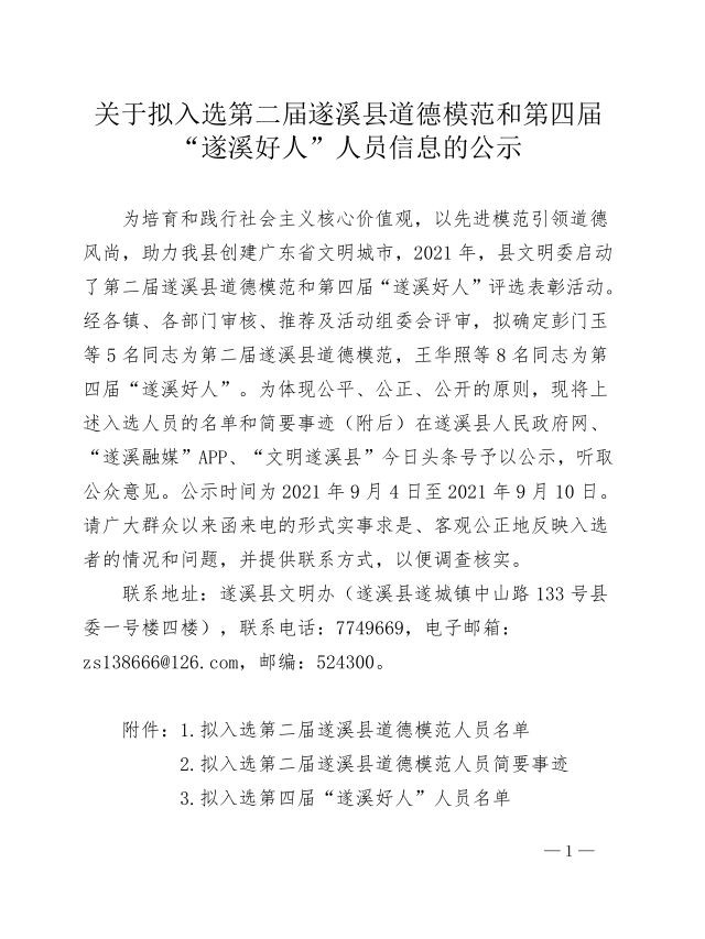 關(guān)于擬入選第二屆遂溪縣道德模范和第四屆“遂溪好人”人員信息的公示 | | 作者: | 來源:遂溪縣精神文明建設(shè)委員會(huì)辦公室 | 時(shí)間:2021-09-03 18:03:34 點(diǎn)擊數(shù):- 具體事跡請(qǐng)看附件:關(guān)于擬入選第二屆遂溪縣道德模范和第四屆”遂溪好人“人員的公示.pdf 【打印正文】