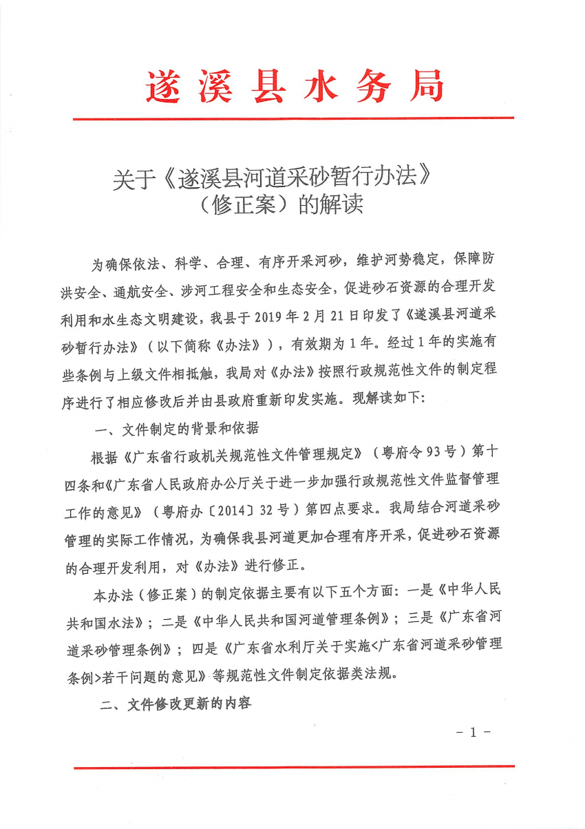 關(guān)于《遂溪縣河道采砂暫行辦法》(修正案)的解讀 | | 作者:遂溪縣水務(wù)局 | 來源:本網(wǎng) | 時間:2021-02-19 15:14:45 點擊數(shù):- 規(guī)范性文件鏈接:遂府規(guī)-2021-001遂溪縣人民政府關(guān)于印發(fā)遂溪縣河道采沙暫行辦法(修正案)的通知(遂府〔2021〕5號) 【打印正文】