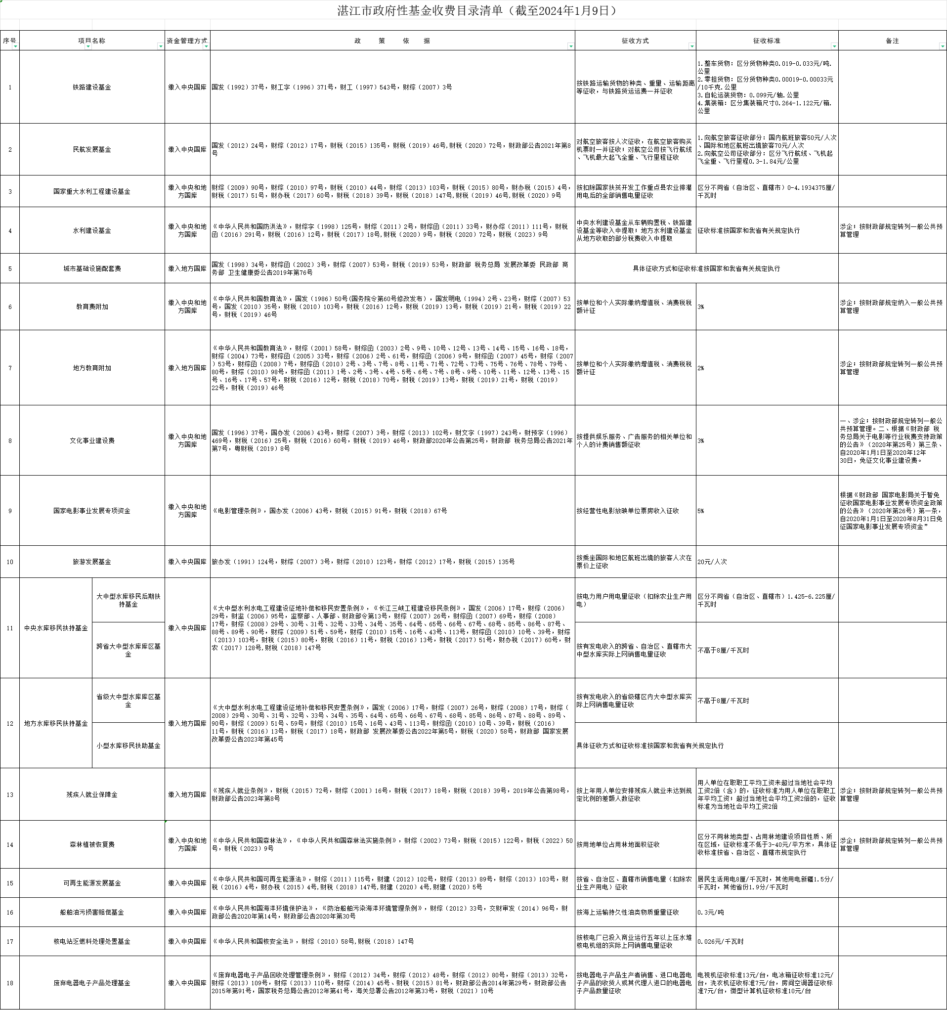 湛江市政府性基金收費目錄清單((截至2024年1月9日)