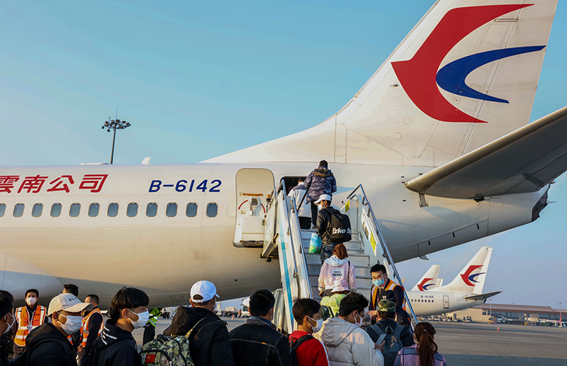 2月26日,云南省組織一批務(wù)工人員乘坐東航返崗包機(jī)前往山東煙臺(tái)復(fù)工。新華社發(fā)(葉勤茹攝)