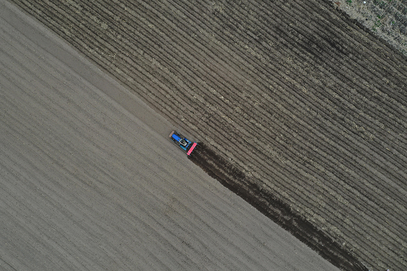 吉林省安圖縣龍山村農(nóng)民在田間播種玉米(5月8日無人機(jī)拍攝)。新華社記者 林宏 攝