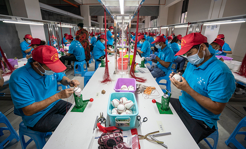 5月14日,云南省怒江傈僳族自治州怒江新城城墻壩易地扶貧安置點(diǎn)棒球工廠的工人在制作棒球。新華社記者 江文耀 攝