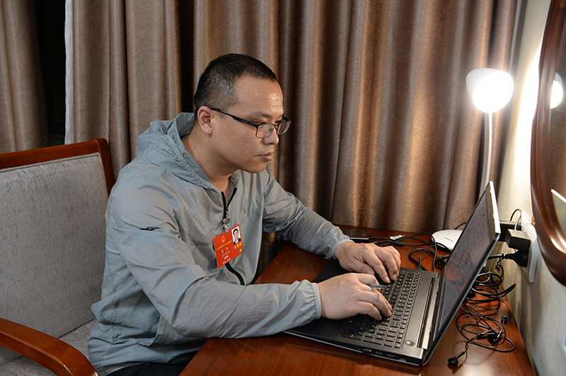 5月21日,全國人大代表董林在山西代表團(tuán)駐地工作。新華社發(fā)(李聯(lián)軍 攝)
