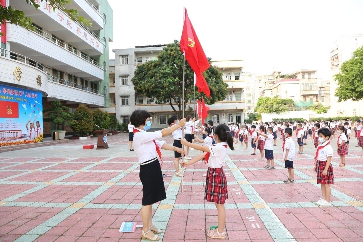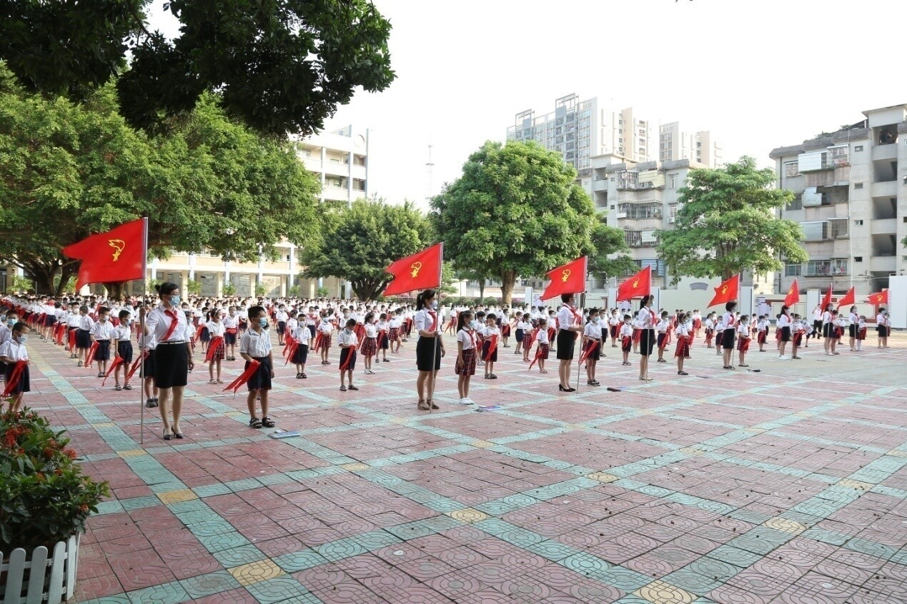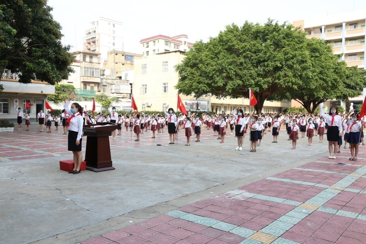 因疫情還沒有解除,為了減少聚集,在大隊(duì)輔導(dǎo)員的主持下,大家按1.5米的距離列隊(duì),整齊的隊(duì)伍布滿了校園。雖然入隊(duì)儀式上沒有鼓號(hào)齊鳴,沒有二至五年級(jí)老隊(duì)員的參與,只有550名一年級(jí)新隊(duì)員和10位一年級(jí)中隊(duì)輔導(dǎo)員,但是會(huì)場氣氛依然隆重、熱烈。