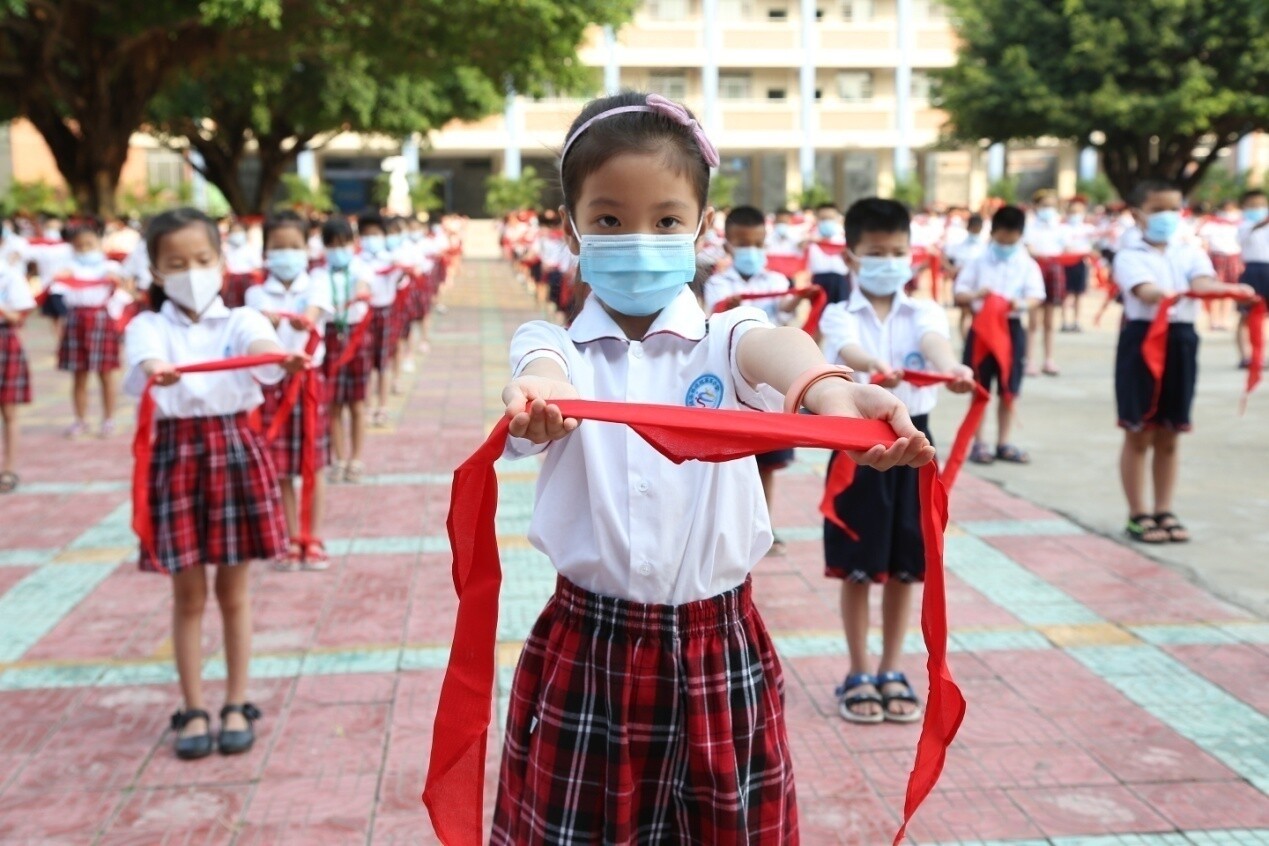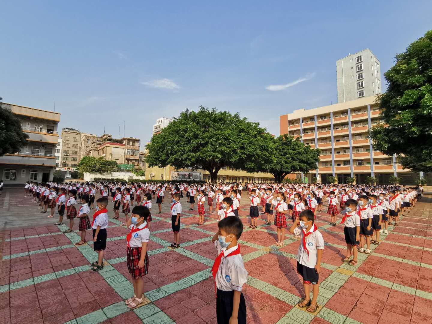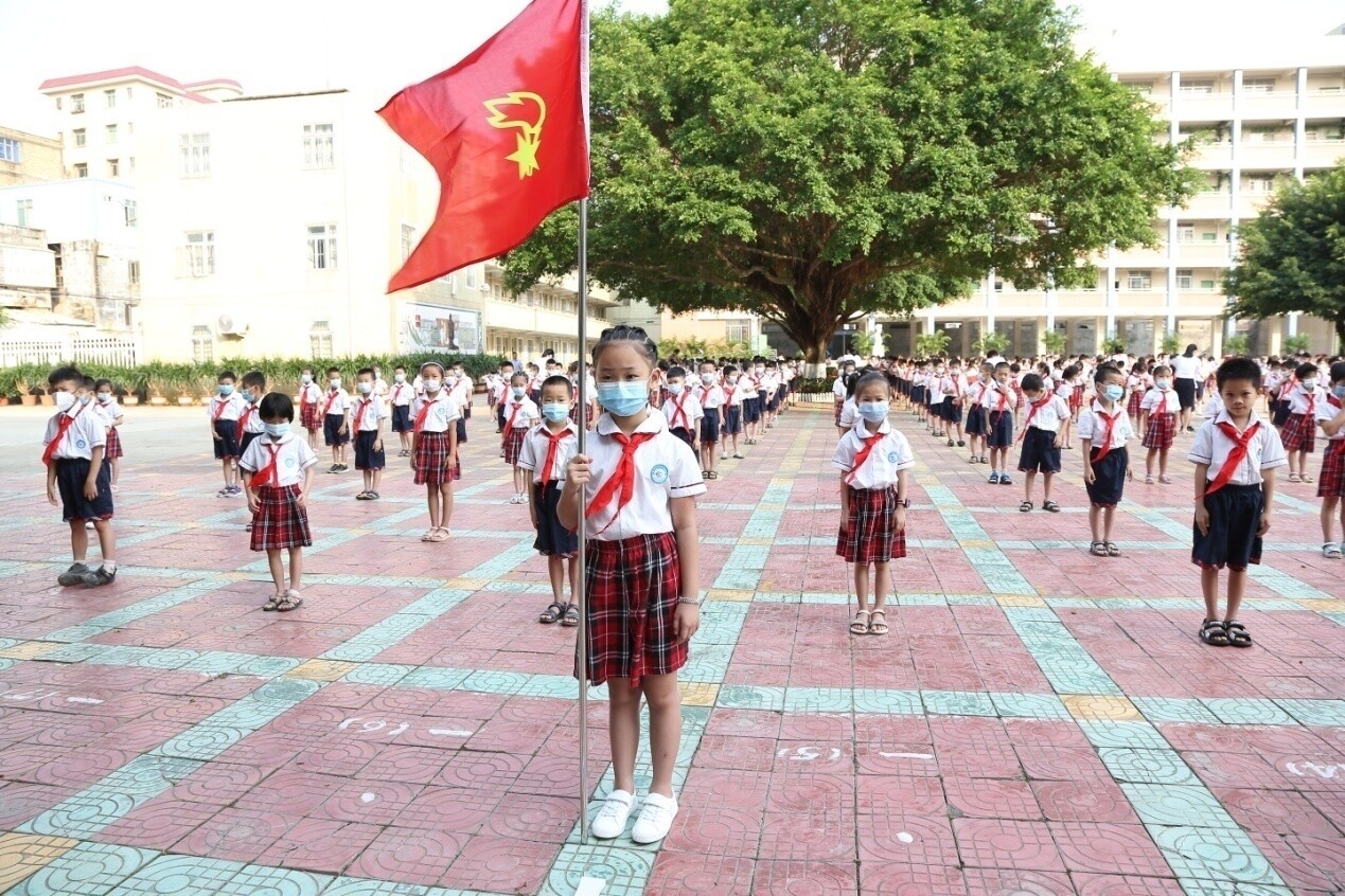 因疫情還沒有解除,為了減少聚集,在大隊(duì)輔導(dǎo)員的主持下,大家按1.5米的距離列隊(duì),整齊的隊(duì)伍布滿了校園。雖然入隊(duì)儀式上沒有鼓號(hào)齊鳴,沒有二至五年級(jí)老隊(duì)員的參與,只有550名一年級(jí)新隊(duì)員和10位一年級(jí)中隊(duì)輔導(dǎo)員,但是會(huì)場氣氛依然隆重、熱烈。