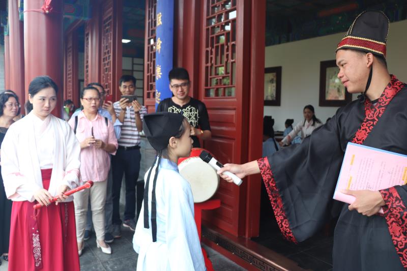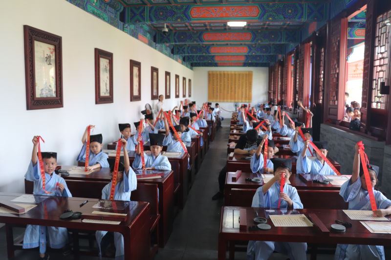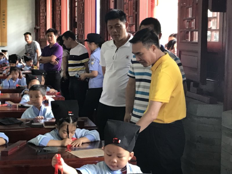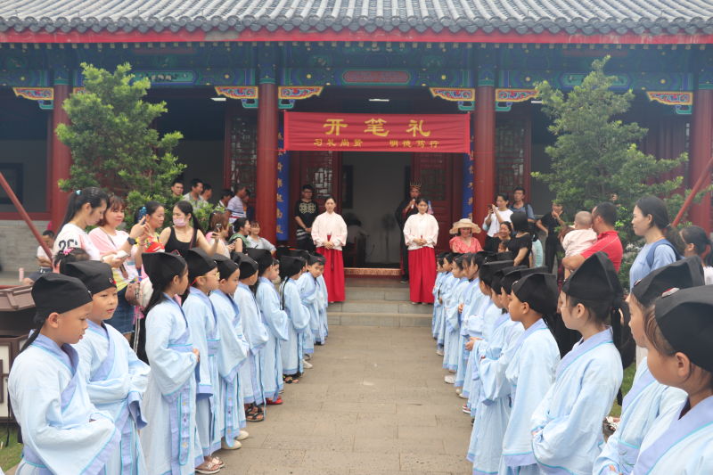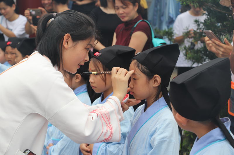 “開筆禮”是中國古代讀書人成長過程中的首次大禮。它形成源于我國傳統(tǒng)人生教育中的“童蒙養(yǎng)正”思想。是傳統(tǒng)教育形式中,對(duì)少兒開始識(shí)字習(xí)禮的一種啟蒙教育。一眾學(xué)童在老師的帶領(lǐng)下,將漢衣冠調(diào)整好后,用朱砂在學(xué)童的額頭正中點(diǎn)上紅痣,意為開啟智慧,以此寄托美好的愿望,寓意著孩子從此眼明心明,好讀書,讀好書。隨后,擊鼓明智,讓孩子們目明耳聰、茅塞頓開、創(chuàng)業(yè)建功;最后在孔子像前接受教育,在老師的指導(dǎo)下寫“人”字,是希望孩子們?cè)谌松膯⒚呻A段學(xué)會(huì)做人,知道做人首先要堂堂正正地立身,要像“人”字那樣頂天立地。