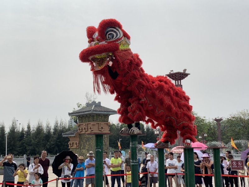 遂溪是中國醒獅之鄉(xiāng),遂溪醒獅表演集舞蹈、雜技、功夫、戲曲、音樂和文學(xué)于一體融合南、北獅表演之長,再配合在高樁上敏捷、靈活的動(dòng)作給廣大游客獻(xiàn)上一臺(tái)精彩紛呈、高潮迭起、驚險(xiǎn)新穎的文體大餐。在3米高的高樁上,醒獅表演者靈活走位,將獅子的神態(tài)、動(dòng)作表現(xiàn)得栩栩如生,整場舞獅表演驚險(xiǎn)刺激,精彩絕倫,引得在場的觀眾連連拍手稱快。