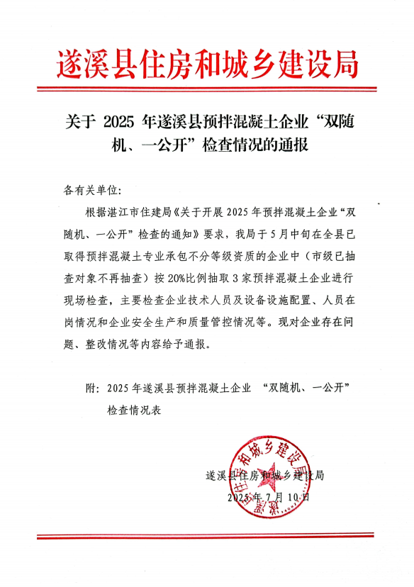 關(guān)于 2025 年遂溪縣預(yù)拌混凝土企業(yè)“雙隨機(jī)、一公開(kāi)”檢查情況的通報(bào).pdf