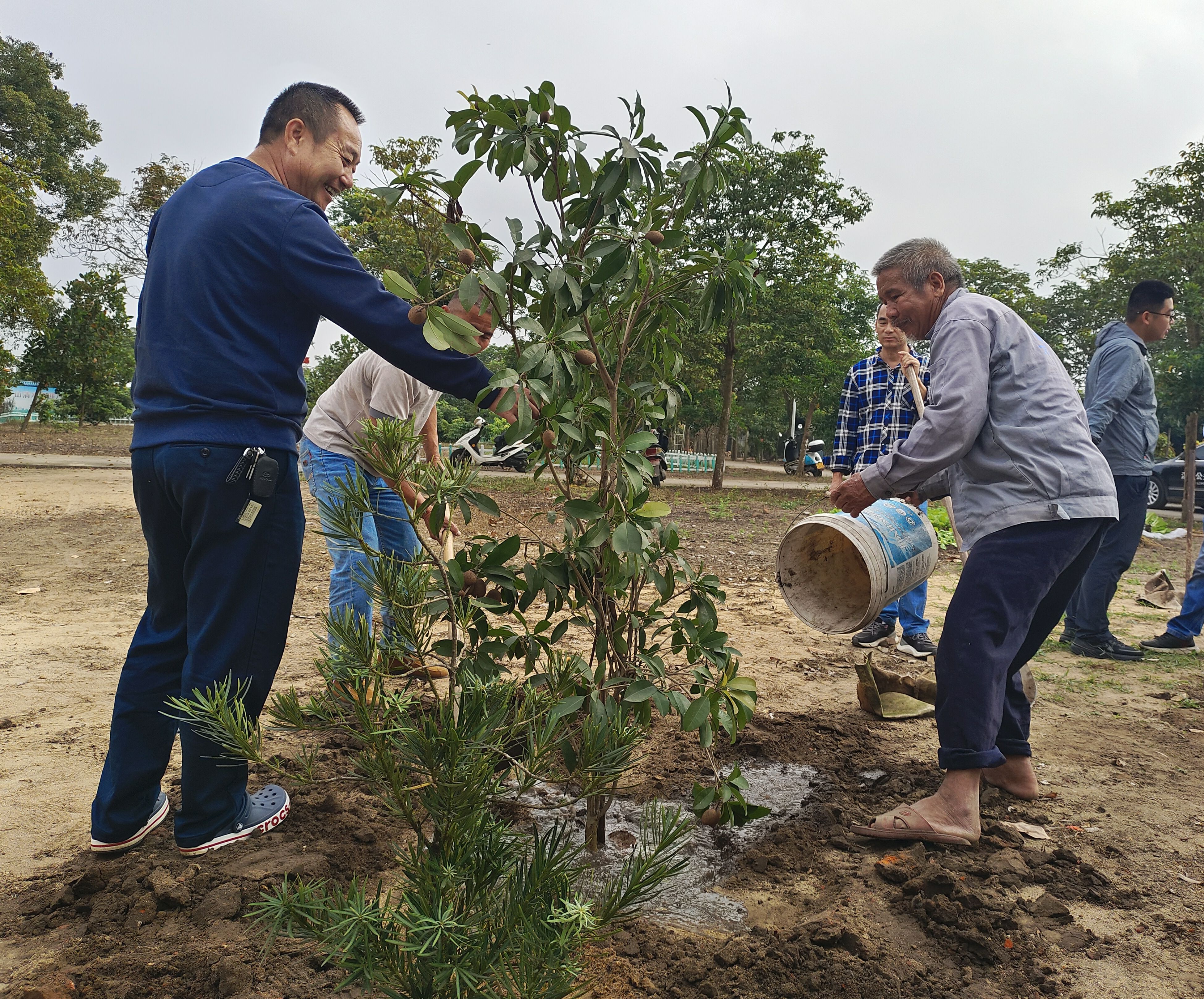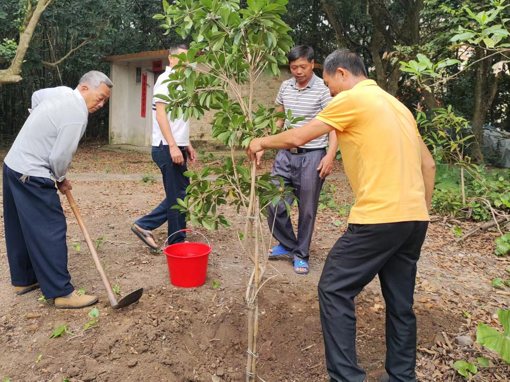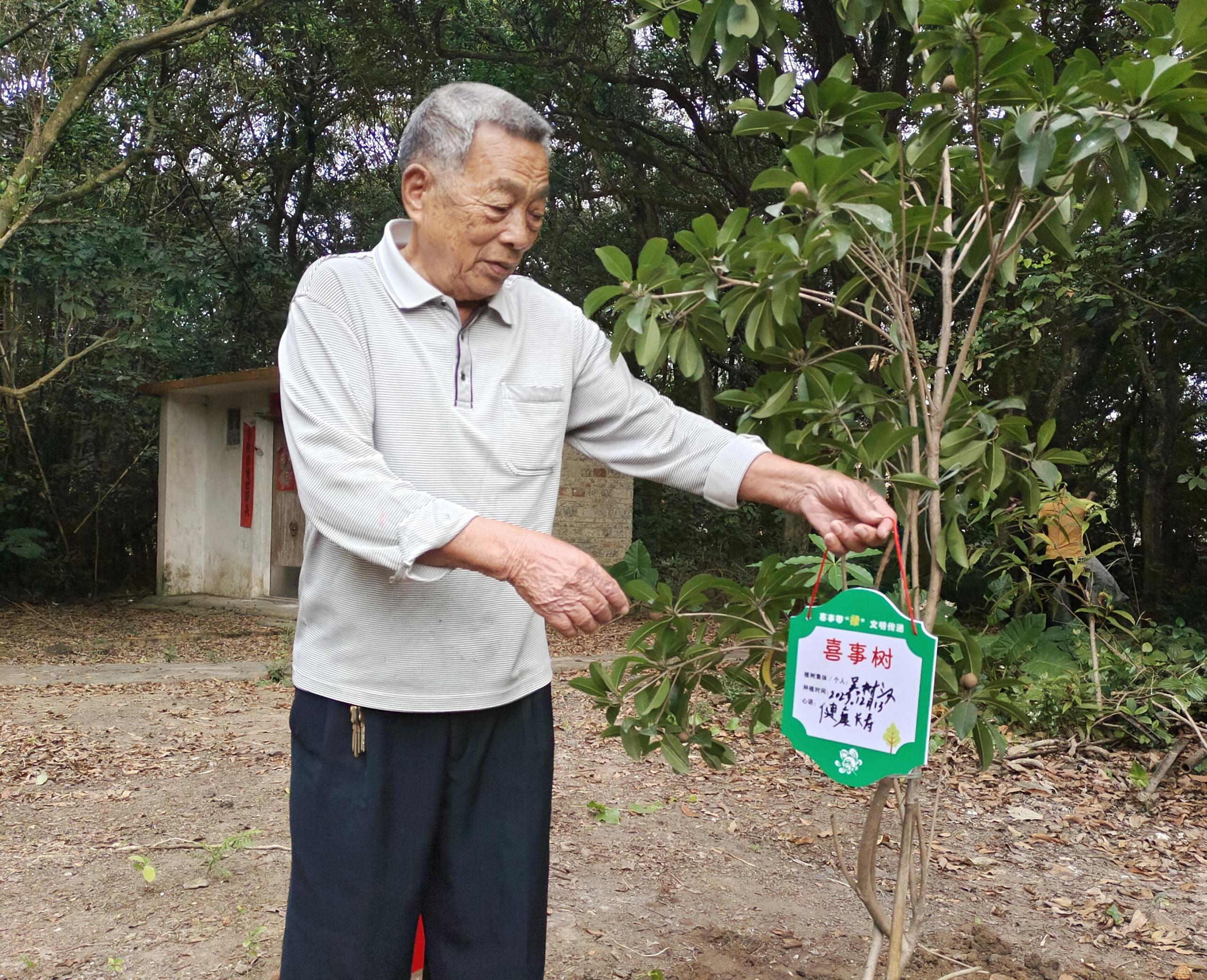 北坡鎮(zhèn)水南村委會瓦窯村有這么一個習俗,村里有重大喜事都喜歡種樹,比如在添丁、生日、賀壽、升學、喬遷、結婚等喜事時,種植一顆“成長樹”、“健康樹”、“長壽樹”、“成才樹”、“幸福樹”、“連理樹”等作為紀念,于是村里便有一片30多畝的生態(tài)林。12月13日是水南村吳樹漢村民的生辰,老人在鎮(zhèn)村干部、家人朋友的幫助下一起拿著鐵鍬,挖坑、栽樹、填土、澆水,壓實新土,種下一顆屬于自己的“長壽果”,寓意健康無恙,幸福安康。