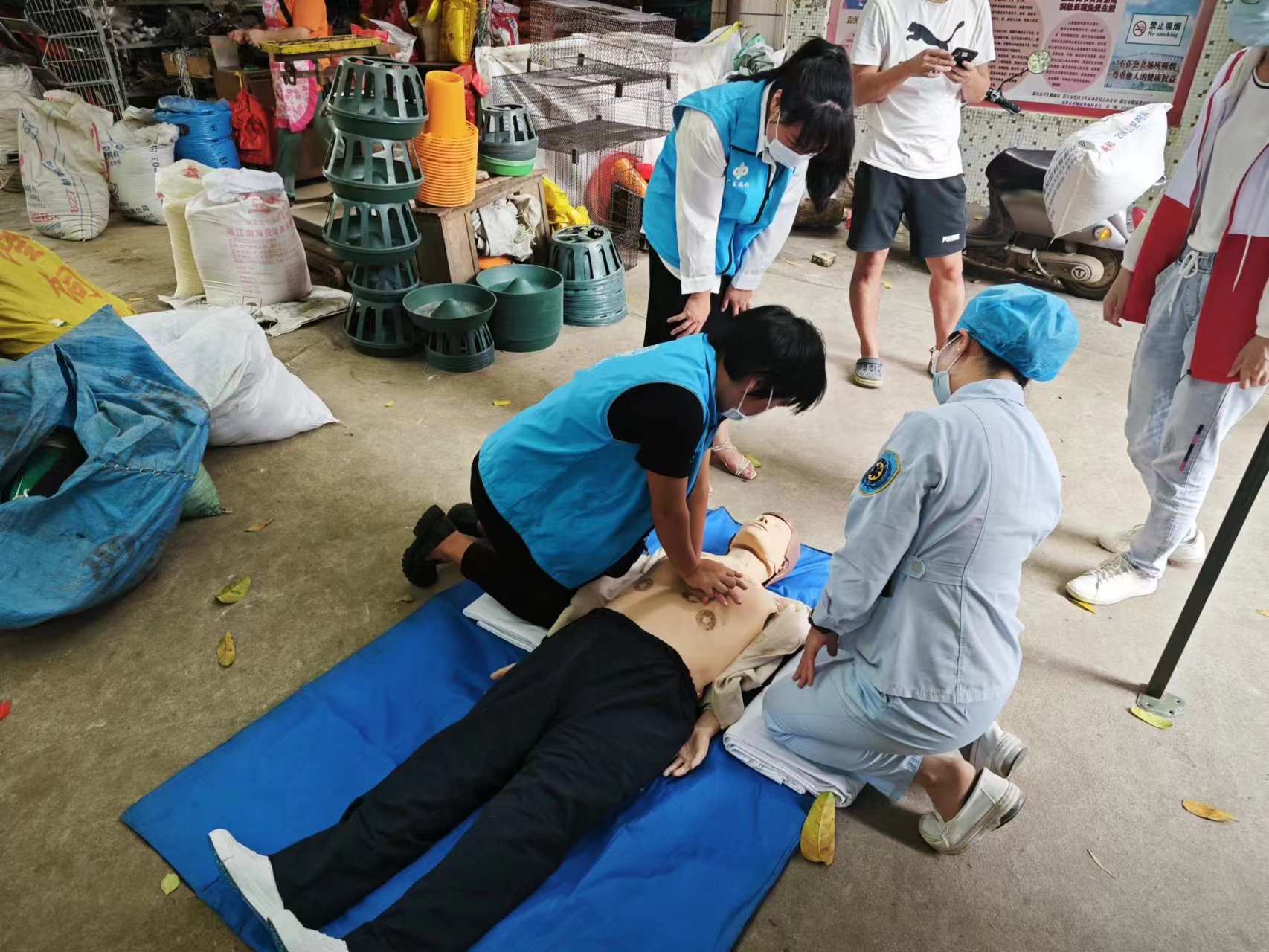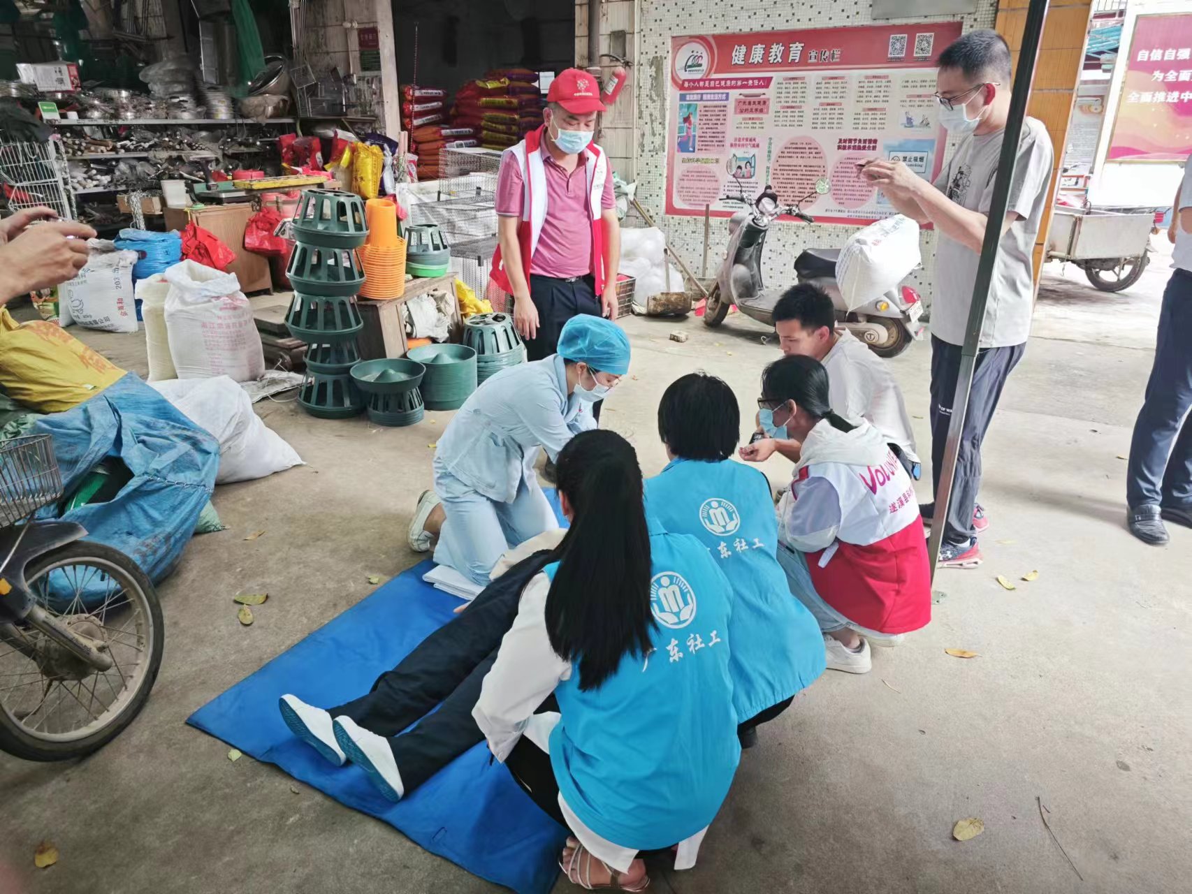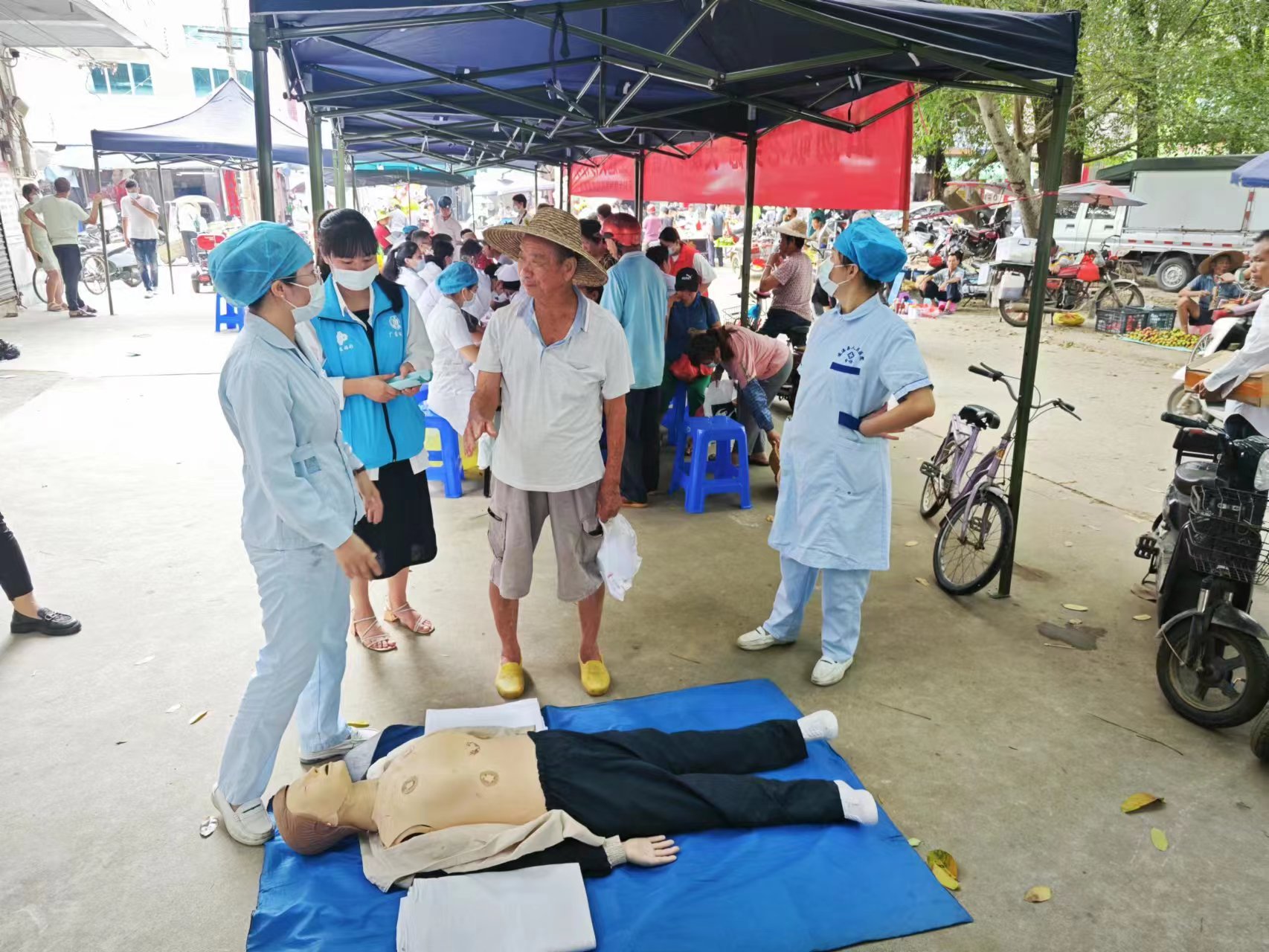 義診現(xiàn)場,醫(yī)護(hù)人員對現(xiàn)場志愿者及群眾展示常見的急救訓(xùn)練。
