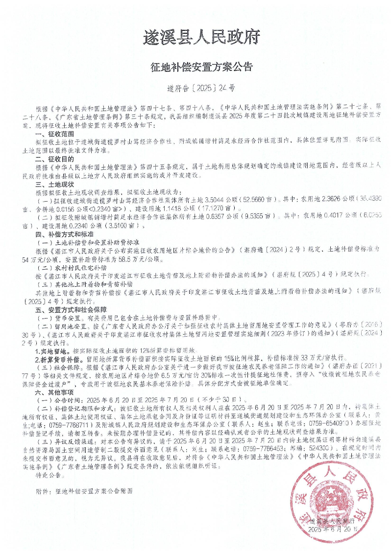 遂溪縣人民政府 征地補償安置方案公告 遂府告〔2025〕24號