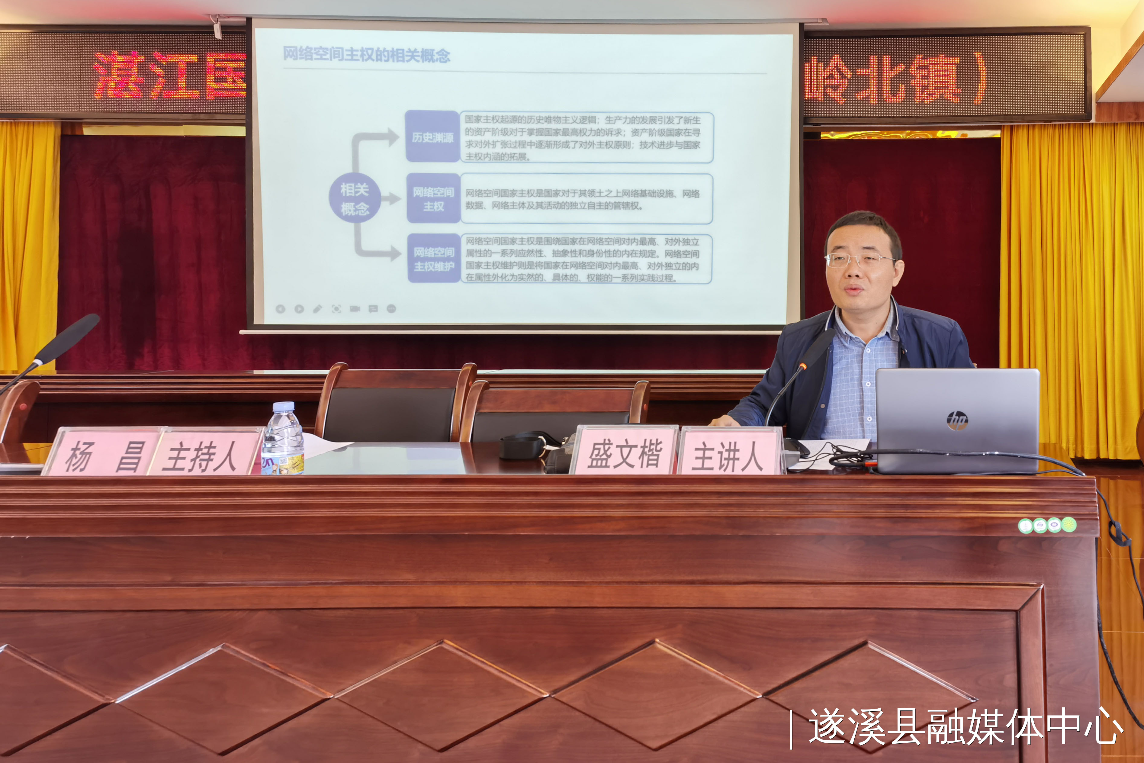 廣東醫(yī)科大學(xué)副教授盛文楷以“永遠跟黨走、共筑強軍夢”為主題,為大家講述了中國網(wǎng)絡(luò)空間主權(quán)維護理論、現(xiàn)狀及路徑等方面的內(nèi)容。講座內(nèi)容豐富、主題鮮明,通過通俗易懂的語言、獨到的見解和圖文并茂的課件,增長了大家的國防知識。