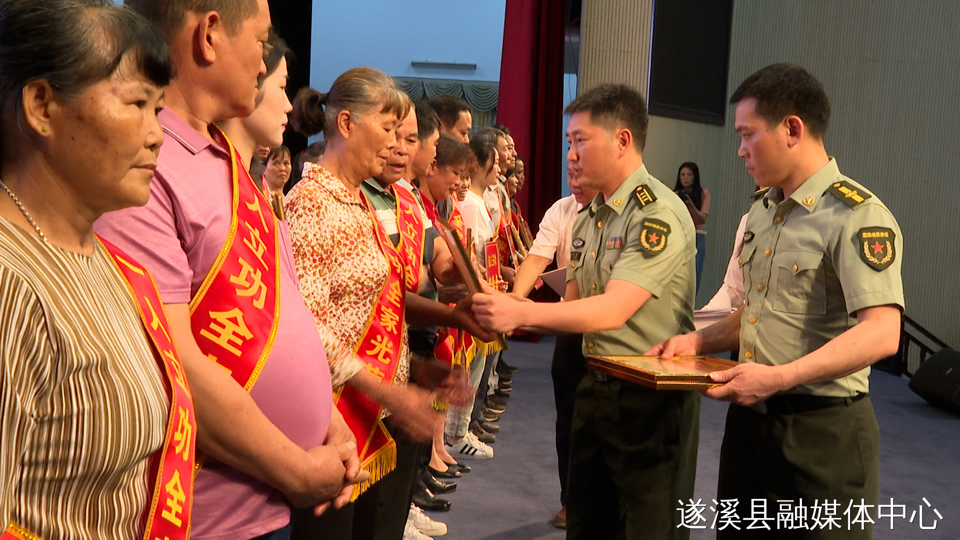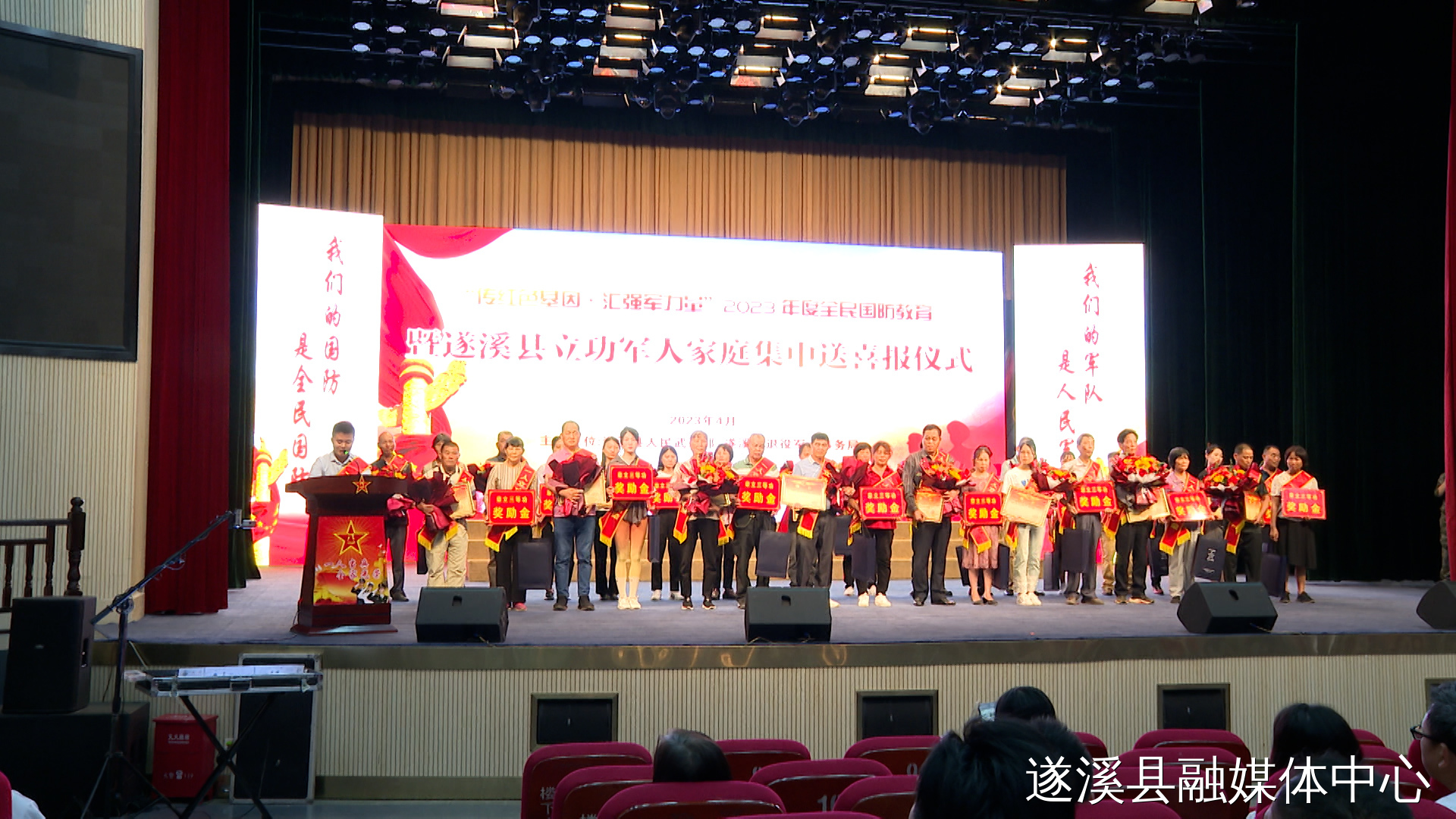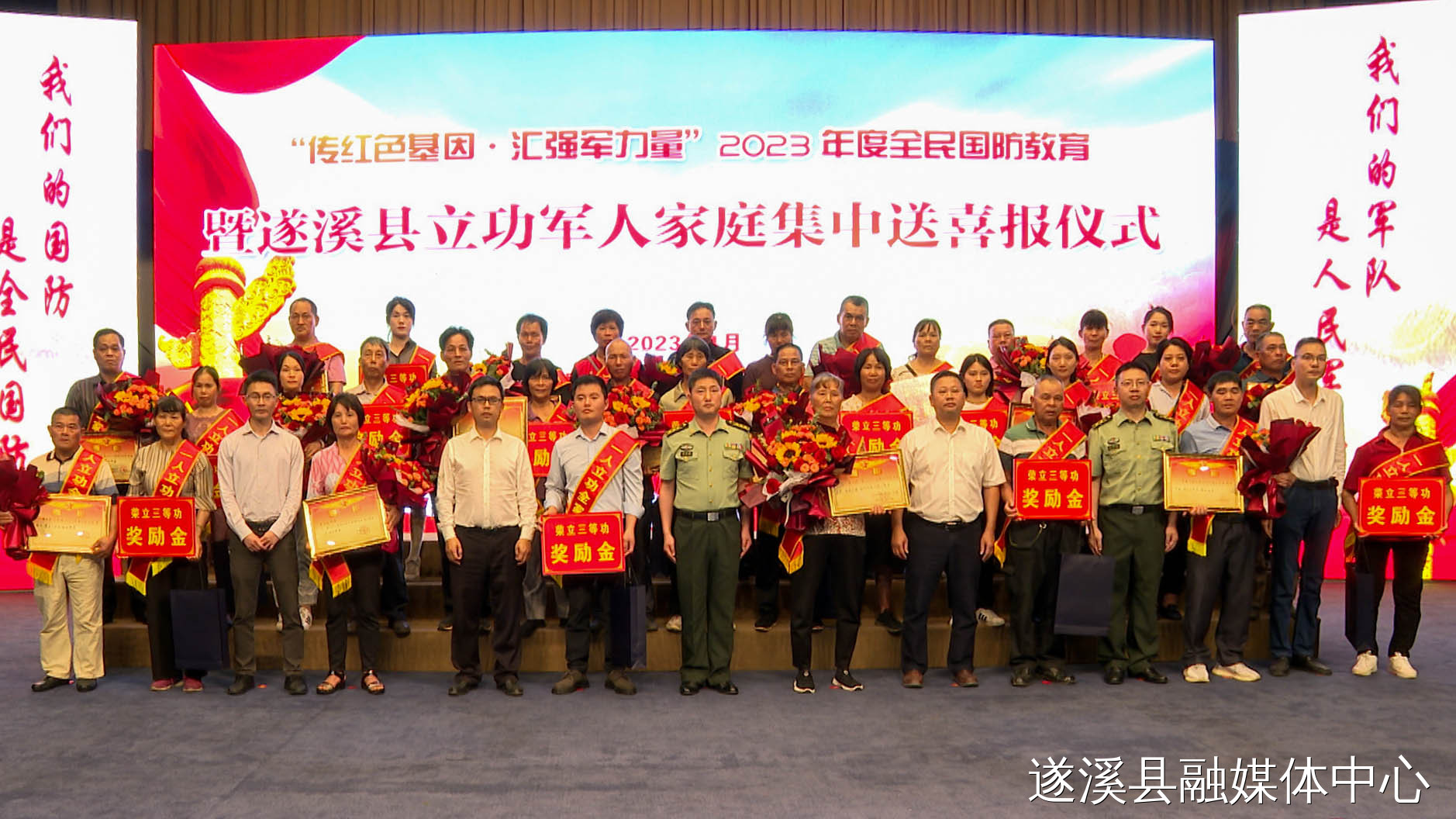 為進一步弘揚新時代擁軍優(yōu)屬光榮傳統(tǒng),切實增強軍人軍屬的榮譽感、獲得感,大力營造“一人立功、全家光榮”的濃厚社會氛圍,4月27日下午,遂溪縣在影劇院舉行“傳紅色基因匯強軍力量”2023年度全民國防教育暨遂溪縣立功軍人家庭集中送喜報儀式,遂溪縣委常委、縣人武部部長曹欣榮,縣退役軍人事務局局長李強為在2022年度17位榮立三等功獎勵的軍人家屬頒發(fā)喜報、贈送獎勵金。學生代表為立功受獎家屬送上鮮花。